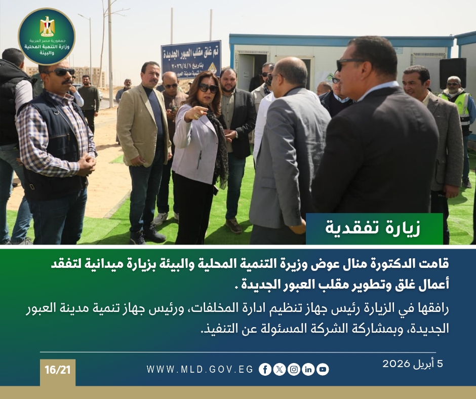 وقامت الدكتورة منال عوض وزيرة التنمية المحلية والبيئة، بزيارة ميداينة لأعمال غلق مدفن العبور الجديدة وتنفيذ خطة تطويره ورفع كفاءته بيئياً ، رافقها في الزيارة ياسر عبد الله رئيس جهاز تنظيم ادارة المخلفات، والمهندس محمود مراد ورئيس جهاز تنمية مدينة العبور الجديدة، وبمشاركة الشركة المسئولة عن التنفيذ.