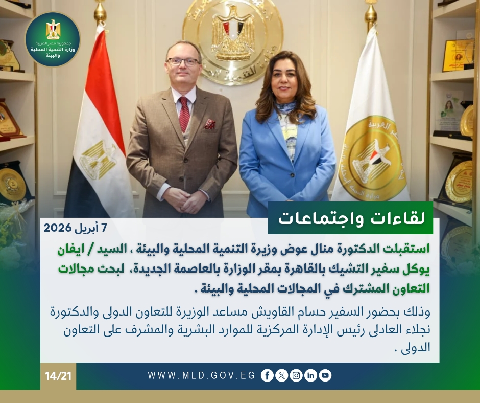 كما استقبلت الدكتورة منال عوض، وزيرة التنمية المحلية والبيئة، السيد إيفان يوكل، سفير التشيك بالقاهرة، لبحث سبل تعزيز التعاون المشترك في مجالات التنمية المحلية والبيئة. تناول اللقاء الاستفادة من مبادرةEU-Horizon) ) التابعة للاتحاد الأوروبي لدعم مشروعات البنية التحتية، وتطوير منظومات النقل الحضري المستدام والطاقة النظيفة بالمحافظات، بما يخدم رؤية مصر للتحول الأخضر.