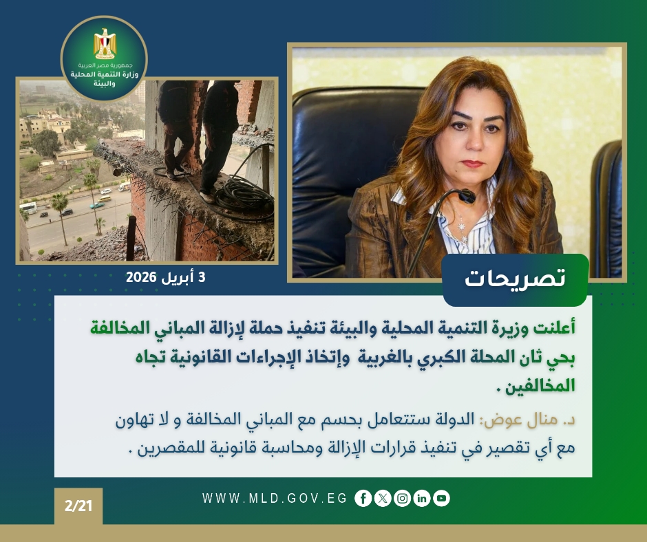 كما أعلنت الدكتورة منال عوض وزيرة التنمية المحلية والبيئة، عن بدء إجراءات إزالة عدد من الأدوار المخالفة بعقارين تحت الإنشاء بحي ثان المحلة الكبرى بمحافظة الغربية وذلك بالتعاون والتنسيق مع الأجهزة التنفيذية بالمحافظة والأجهزة المعنية بمديرية أمن الغربية .