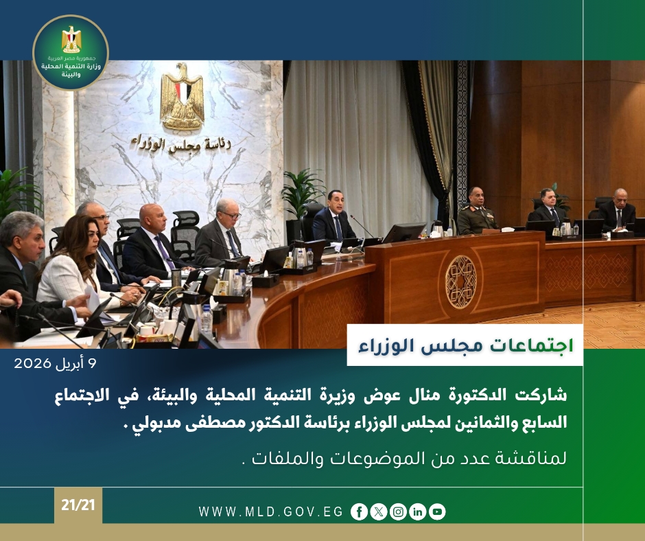 كما شاركت الدكتورة منال عوض وزيرة التنمية المحلية والبيئة في الاجتماع السابع والثمانين لمجلس الوزراء برئاسة الدكتور مصطفى مدبولي رئيس مجلس الوزراء لمناقشة عدد من الموضوعات والملفات .