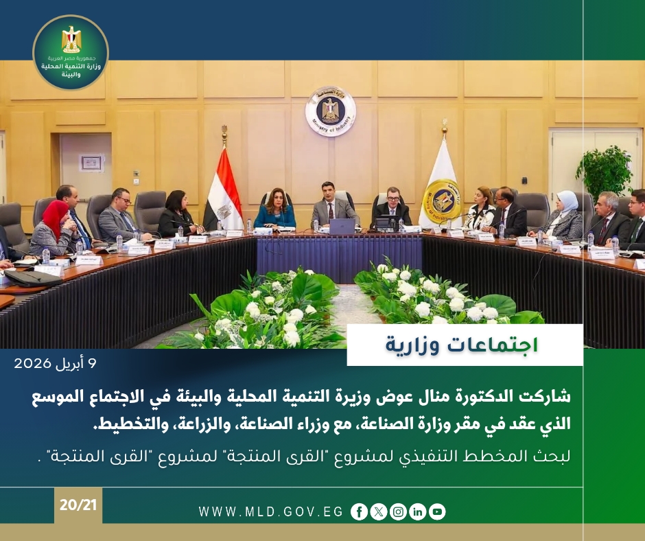 وشاركت الدكتورة منال عوض وزيرة التنمية المحلية والبيئة في الاجتماع الموسع الذي عقد في مقر وزارة الصناعة، مع وزراء الصناعة، والزراعة، والتخطيط، لبحث المخطط التنفيذي لمشروع "القرى المنتجة". يستهدف المشروع تحويل القرى المصرية إلى مراكز إنتاجية متكاملة عبر استغلال البنية التحتية لمبادرة "حياة كريمة"، مع التركيز على الصناعات الزراعية والغذائية والنسيجية كبداية لتوفير فرص عمل لائقة، لاسيما للمرأة والشباب، بما يضمن استدامة التنمية ورفع مستوى المعيشة بالريف.
