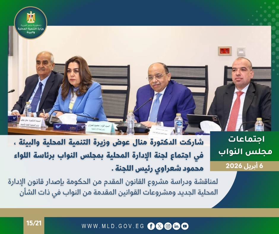 كما شاركت الدكتورة منال عوض وزيرة التنمية المحلية والبيئة ، في اجتماع لجنة الإدارة المحلية بمجلس النواب برئاسة اللواء محمود شعراوي رئيس اللجنة وحضور وكلاء ومقرر اللجنة وعدد من رؤساء اللجان المختلفة بمجلس النواب وعدد كبير من السادة النواب وقيادات الوزارة لمناقشة مشروع قانون الإدارة المحلية الجديد .