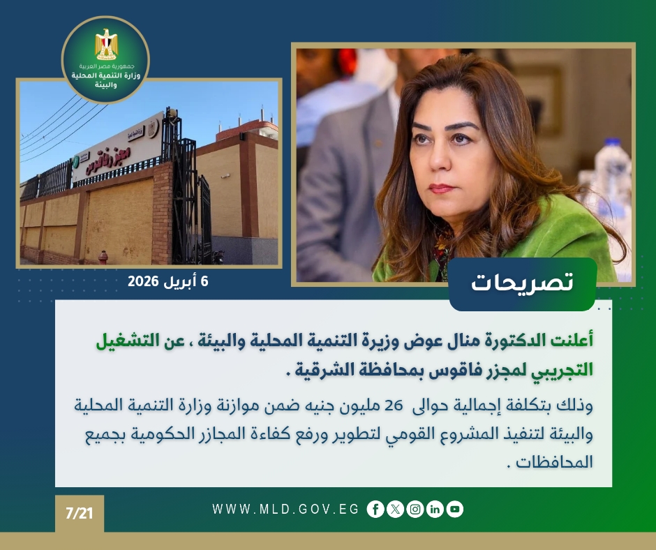 أعلنت الدكتورة منال عوض وزيرة التنمية المحلية والبيئة ، عن التشغيل التجريبي لمجزر فاقوس بمحافظة الشرقية وذلك بتكلفة إجمالية حوالى 26 مليون جنيه ضمن موازنة وزارة التنمية المحلية والبيئة لتنفيذ المشروع القومي لتطوير ورفع كفاءة المجازر الحكومية بجميع المحافظات .