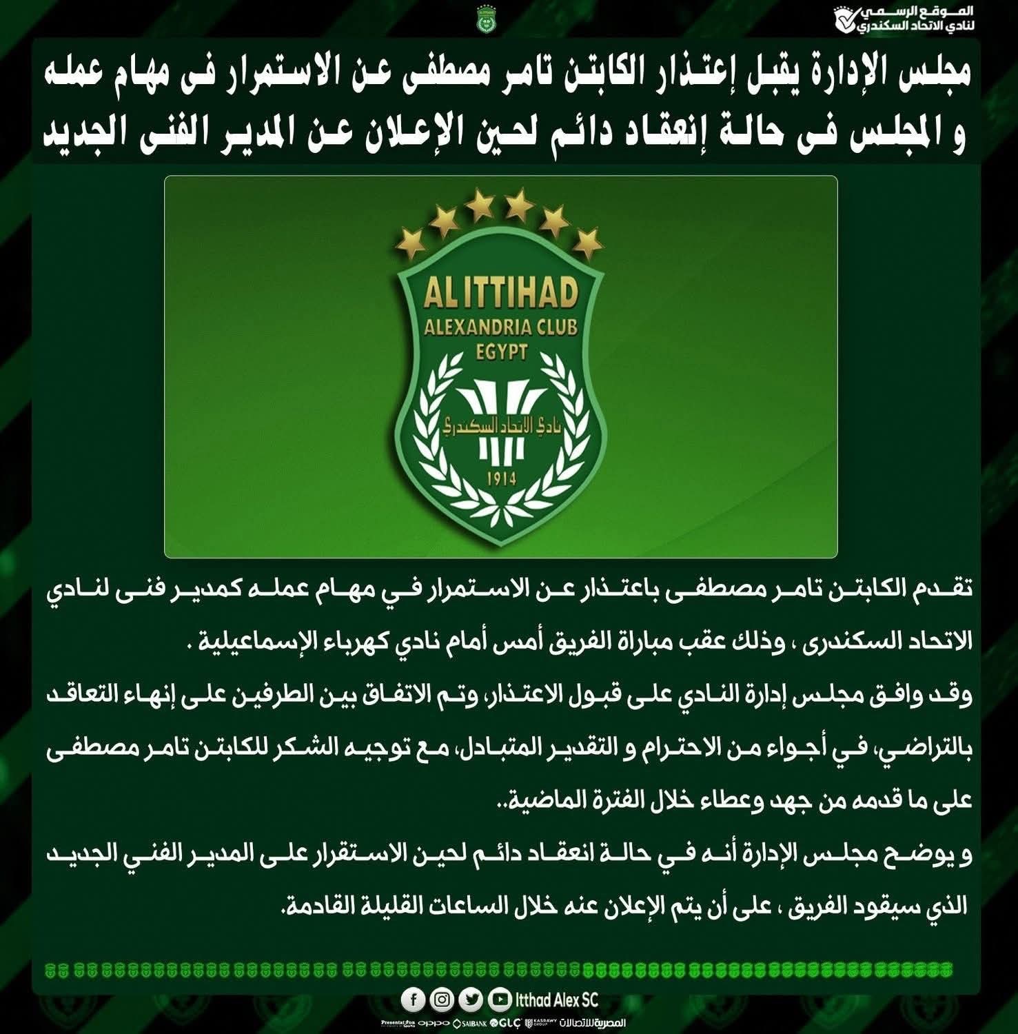 وافق مجلس ادارة نادى الاتحاد السكندري، برئاسة محمد أحمد سلامة، رئيس النادي، على قبول اعتذار تامر مصطفى المدير الفنى للفريق الأول لكرة القدم، عن الاستمرار في مهام عمله.