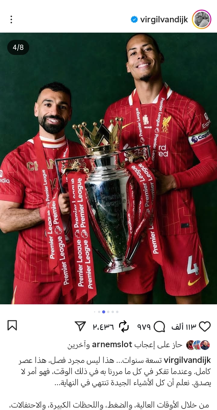 وكتب فان دايك عبر حسابه على إنستجرام: "تسع سنوات لم تكن مجرد فترة عادية، بل كانت رحلة استثنائية بكل ما تحمله الكلمة من معنى، عندما أسترجع ما عشناه سويًا، أدرك حجم اللحظات الرائعة التي مررنا بها، رغم أننا نعلم أن لكل قصة نهاية.