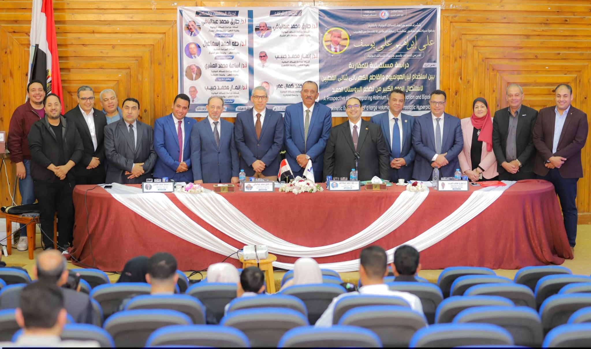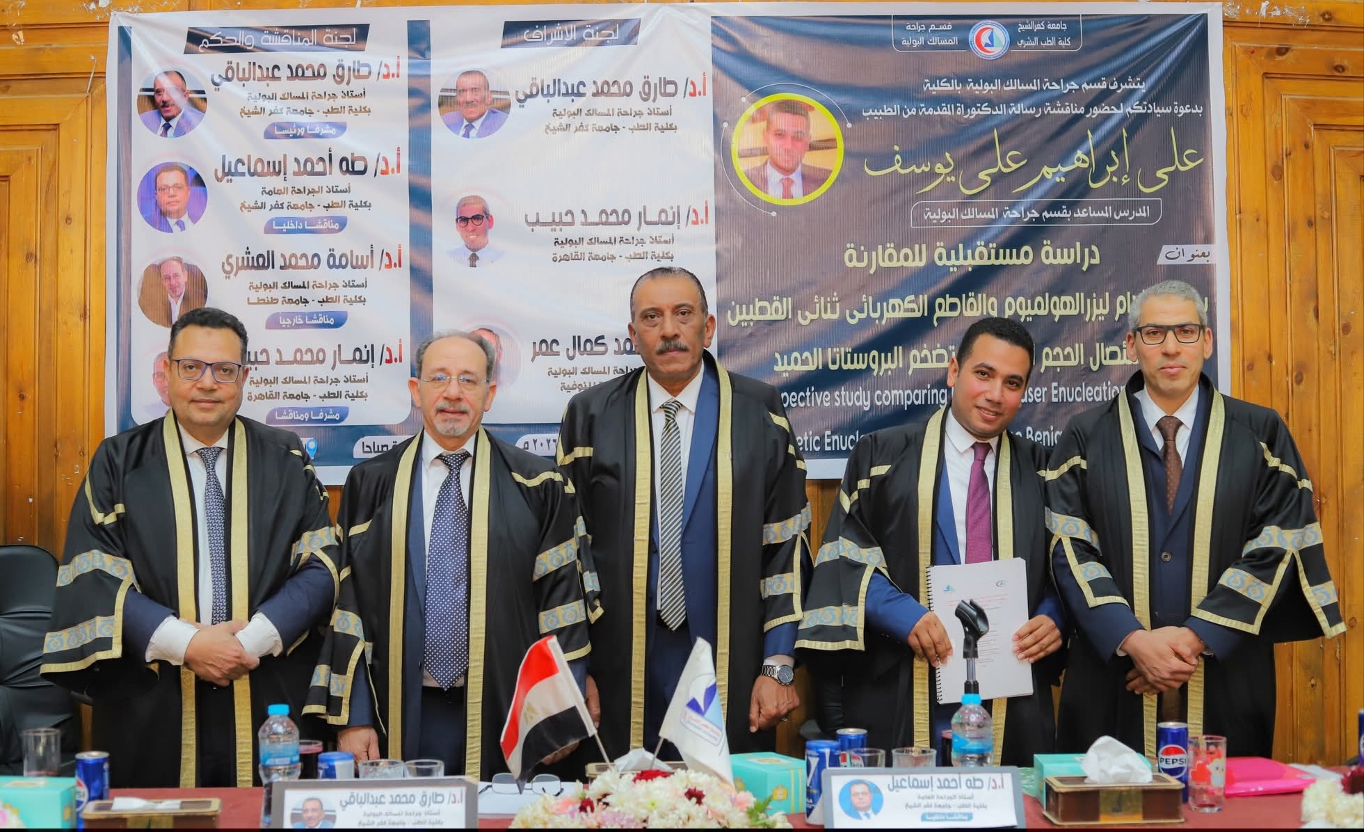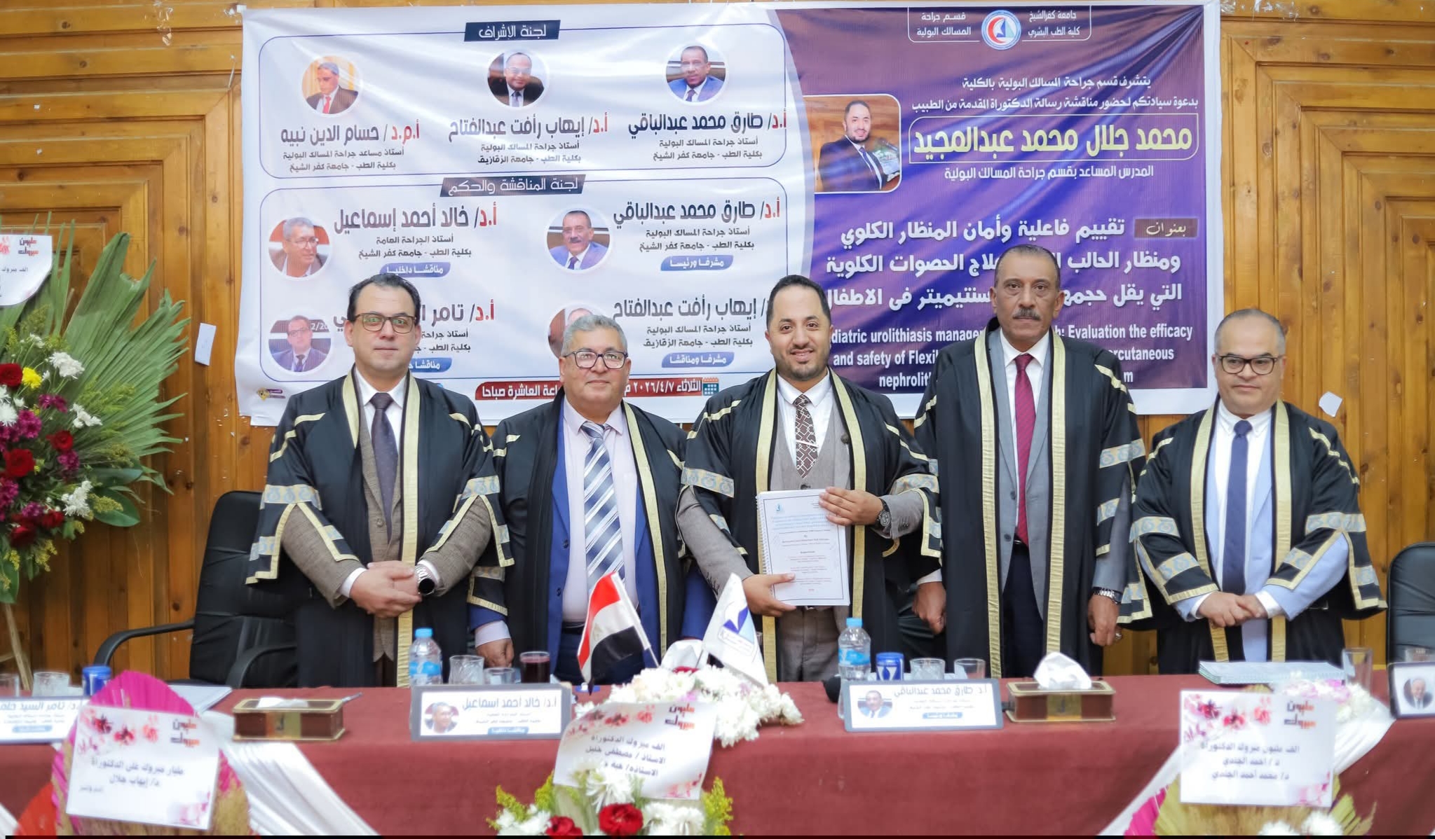 ضمت لجنة المناقشة والحكم كلاً من: الدكتور طارق محمد عبد الباقي، أستاذ جراحة المسالك البولية بكلية الطب جامعة كفر الشيخ «مشرفاً ورئيساً»، الدكتور إيهاب رأفت عبد الفتاح، أستاذ جراحة المسالك البولية بكلية الطب جامعة الزقازيق «مشرفاً ومناقشاً»، والدكتور خالد أحمد إسماعيل، أستاذ الجراحة العامة بكلية الطب جامعة كفر الشيخ «مناقشاً داخلياً»، والدكتور تامر السيد حلمي، أستاذ جراحة المسالك البولية بكلية الطب جامعة المنصورة «مناقشاً خارجياً»، والدكتور حسام الدين نبيه، أستاذ مساعد جراحة المسالك البولية بكلية الطب جامعة كفر الشيخ «مشرفاً».