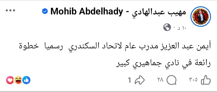 وكتب مهيب عبد الهادي عبر حسابه على موقع "فيسبوك": "أيمن عبد العزيز مدرب عام للاتحاد السكندري رسميًا.. خطوة رائعة في نادٍ جماهيري كبير".