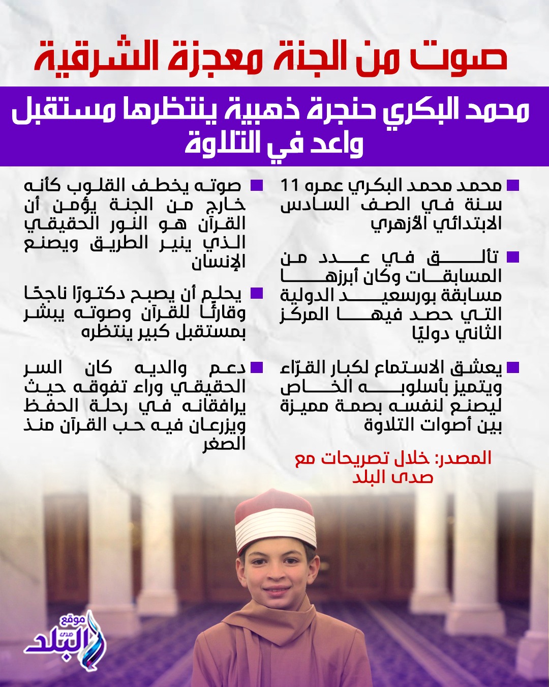 في محافظة الشرقية، يبرز الأزهري الموهوب محمد محمد البكري صاحب الـ11 عامًا، تلميذ الصف السادس الابتدائي الأزهري، كموهبة قرآنية لافتة يُطلق عليها البعض «حنجرة ذهبية» نظرًا لعذوبة صوته وقوة حضوره في التلاوة، ما جعله يحظى باهتمام واسع ومستقبل واعد في عالم قراءة القرآن الكريم.