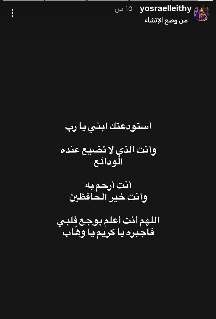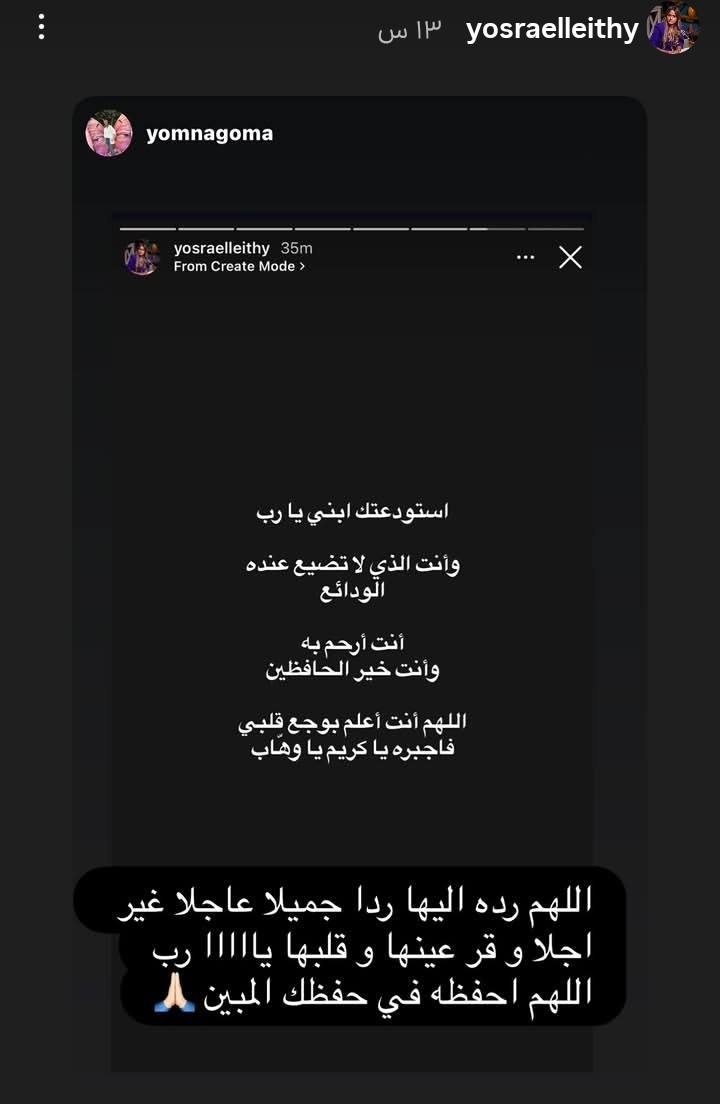 ونشرت يسرا الليثي، زوجة أحمد حسام ميدو، تعليقًا مؤثرًا عبر حسابها الرسمي على "إنستجرام"، عبّرت فيه عن حالتها النفسية الصعبة حيث كتبت:"استودعك ابنى يارب وانت الذي لاتضيع عنده الودائع انت ارحم به وانت خير الحافظين اللهم اعلم انت بوجع قلبي فاجبره ياكريم ياوهاب"
