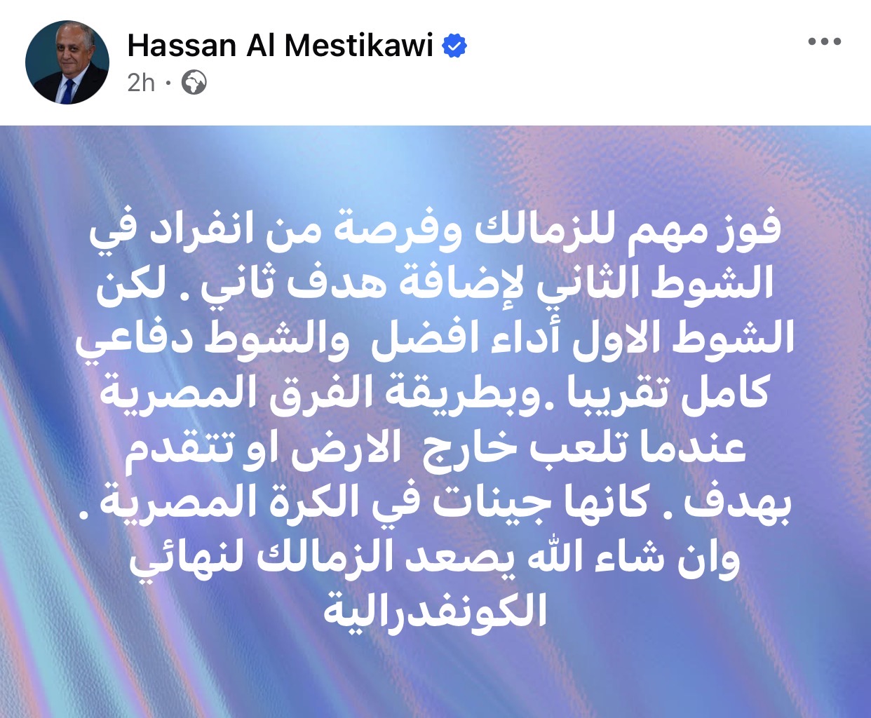وكتب حسن المستكاوي عبر حسابه على موقع فيسبوك: “فوز مهم للزمالك وفرصة من انفراد في الشوط الثاني لإضافة هدف ثاني”.