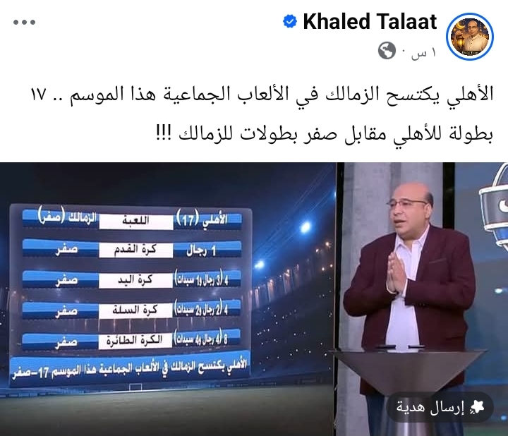 وكتب خالد طلعت عبر حسابه على موقع التواصل الاجتماعي “فيسبوك”: «الأهلي يكتسح الزمالك في الألعاب الجماعية هذا الموسم، 17 بطولة للأهلي مقابل صفر بطولات للزمالك».