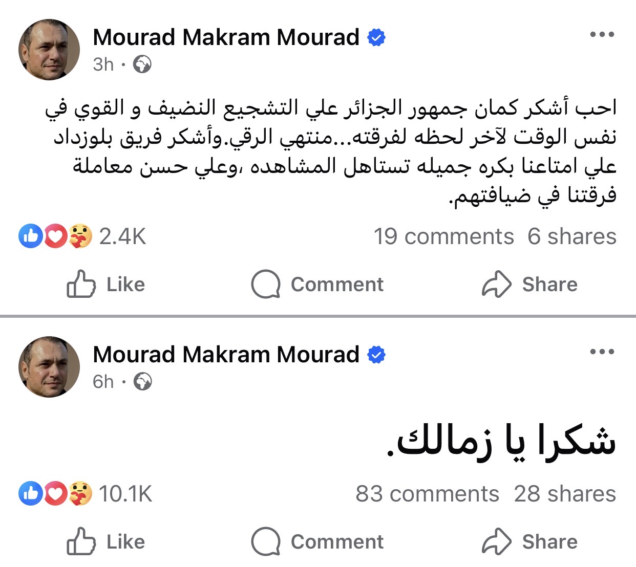 وفي منشور آخر، حرص مراد مكرم على توجيه الشكر لجماهير الجزائر، مشيدًا بتشجيعهم القوي والمتحضر لفريقهم حتى اللحظات الأخيرة من المباراة، واصفًا إياه بـ”منتهى الرقي”.