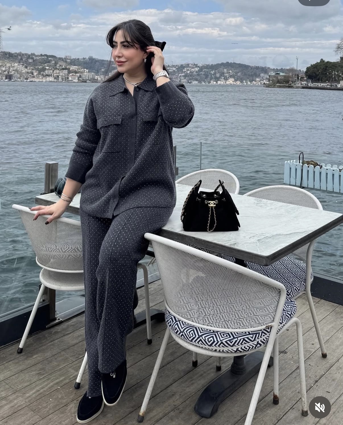 ظعرت بوسي خلال رحلاتها لتركيا بإطلالة عصرية، حيث ارتدت قميص بااللون الرمادي المطرز بالكامل مع بنطلون بنفس اللون والتطريز.