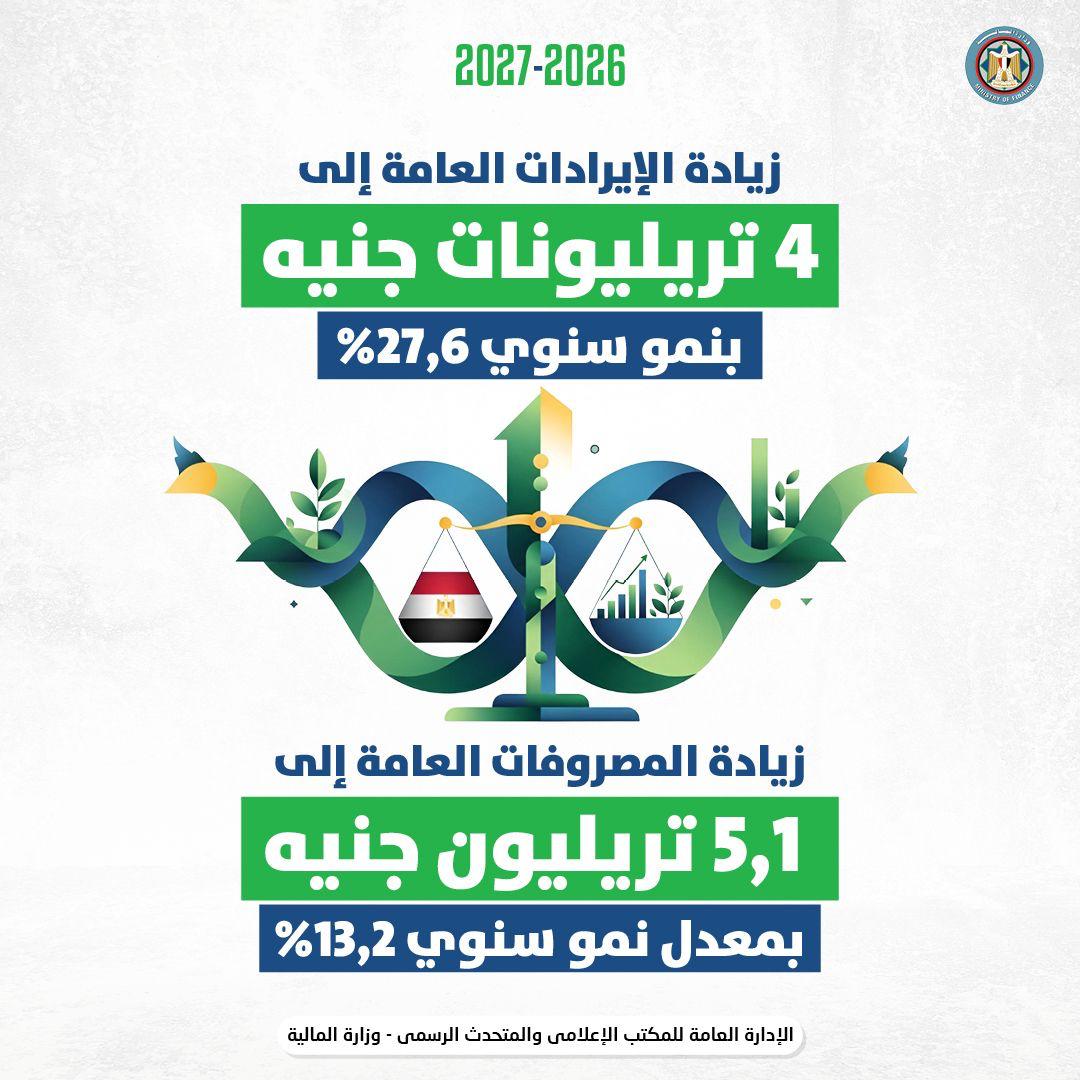 وأوضح أن الإيرادات العامة المستهدفة خلال العام المالى المقبل تبلغ ٤ تريليونات جنيه بزيادة ٢٧,٦٪ ، بينما المصروفات العامة المتوقعة تبلغ ٥,١ تريليون جنيه بمعدل نمو ١٣,٢٪.