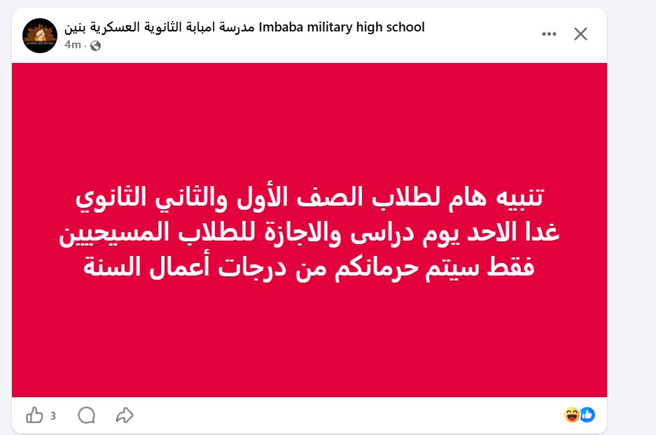 نشرت الصفحات الرسمية للمدارس تنبيها عاجلاً ، أكدت خلاله أن غداً الأحد اجازة للطلاب المسيحيين فقط ، وعلى باقي الطلاب الإلتزام بالحضور حرصا على درجات أعمال السنة .