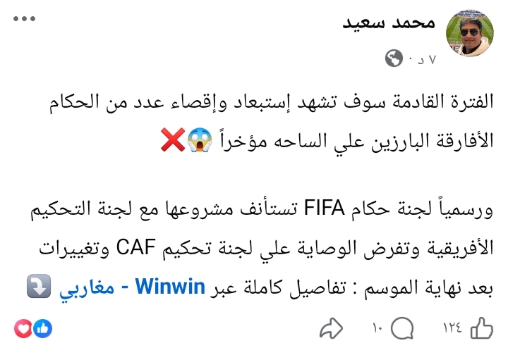 واضاف"لجنة حكام FIFA تستأنف مشروعها مع لجنة التحكيم الأفريقية وتفرض وصاية على لجنة تحكيم CAF، مع إجراء تغييرات عقب نهاية الموسم"