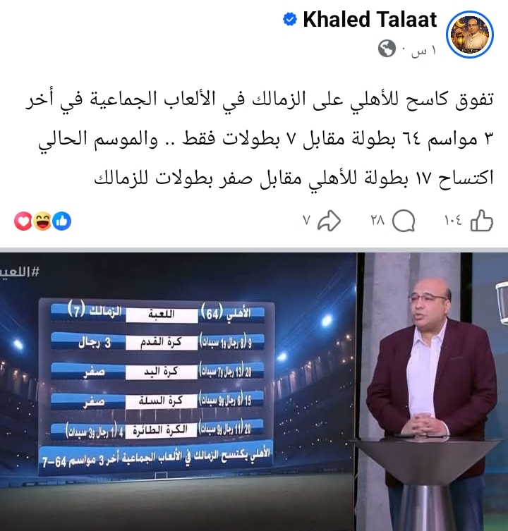 وكتب خالد طلعت عبر حسابه على موقع التواصل الاجتماعي “فيسبوك":"تفوق كاسح للأهلي على الزمالك في الألعاب الجماعية في أخر ٣ مواسم ٦٤ بطولة مقابل ٧ بطولات فقط .. والموسم الحالي اكتساح ١٧ بطولة للأهلي مقابل صفر بطولات للزمالك"