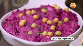 وقدمت الشيف فاطمة أبو حاتي طريقة عمل سلطة بطارخ الرنجة بالبنجر، وهي وصفة تجمع بين الطعم الغني والشكل الجذاب باللون الوردي.