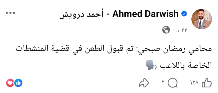 وكتب الناقد الرياضي احمد درويش عبر حسابه علي فيسبوك "محامي رمضان صبحي: تم قبول الطعن في قضية المنشطات الخاصة باللاعب".
