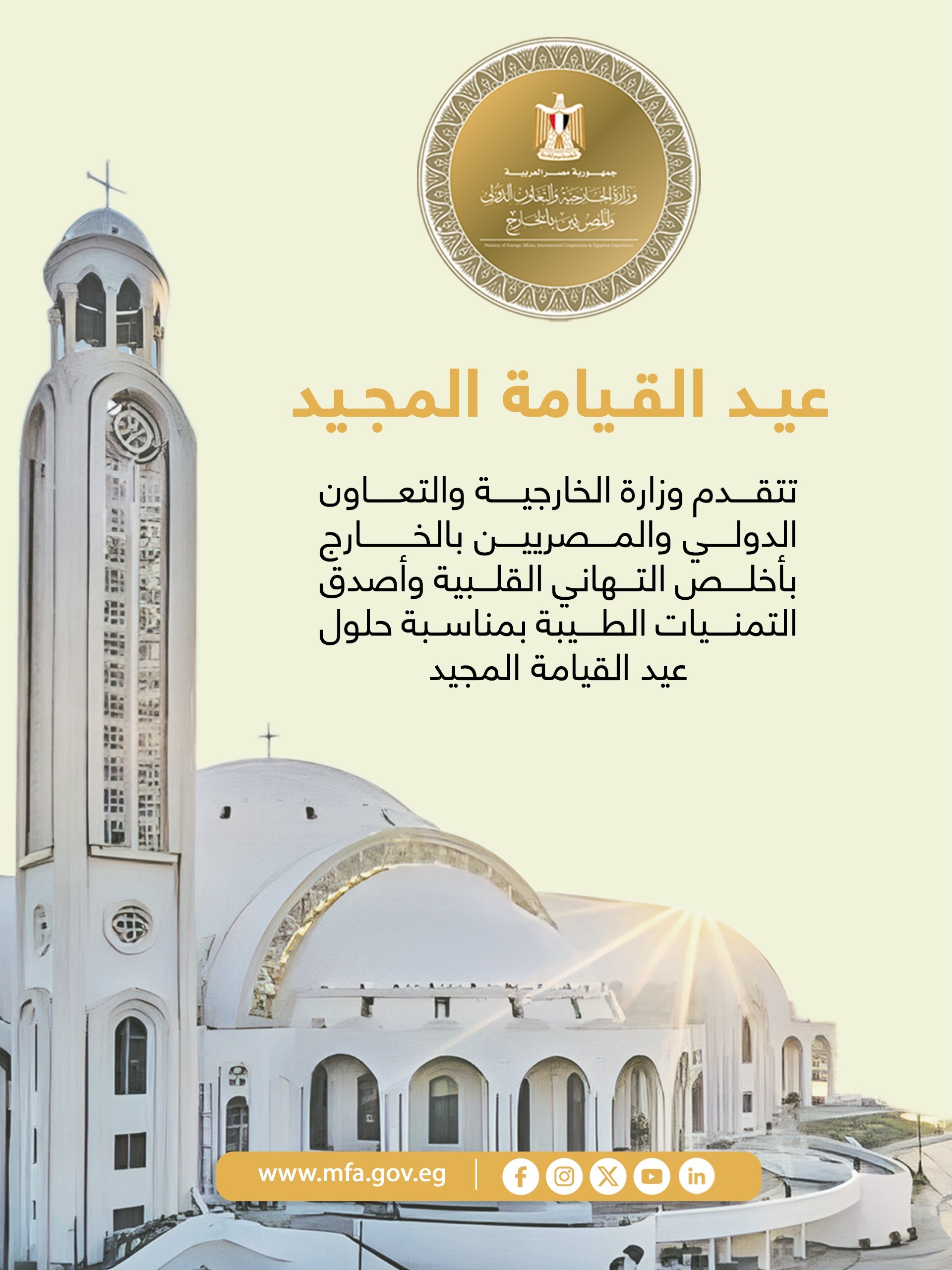 تقدمت وزارة الخارجية والتعاون الدولي و المصريين بالخارج، بالتهنئة للمواطنيين الأقباط بمناسبة عيد القيامة المجيد، متمنية أخلص التهاني القلبية وأصدق التمنيات الطيبة .