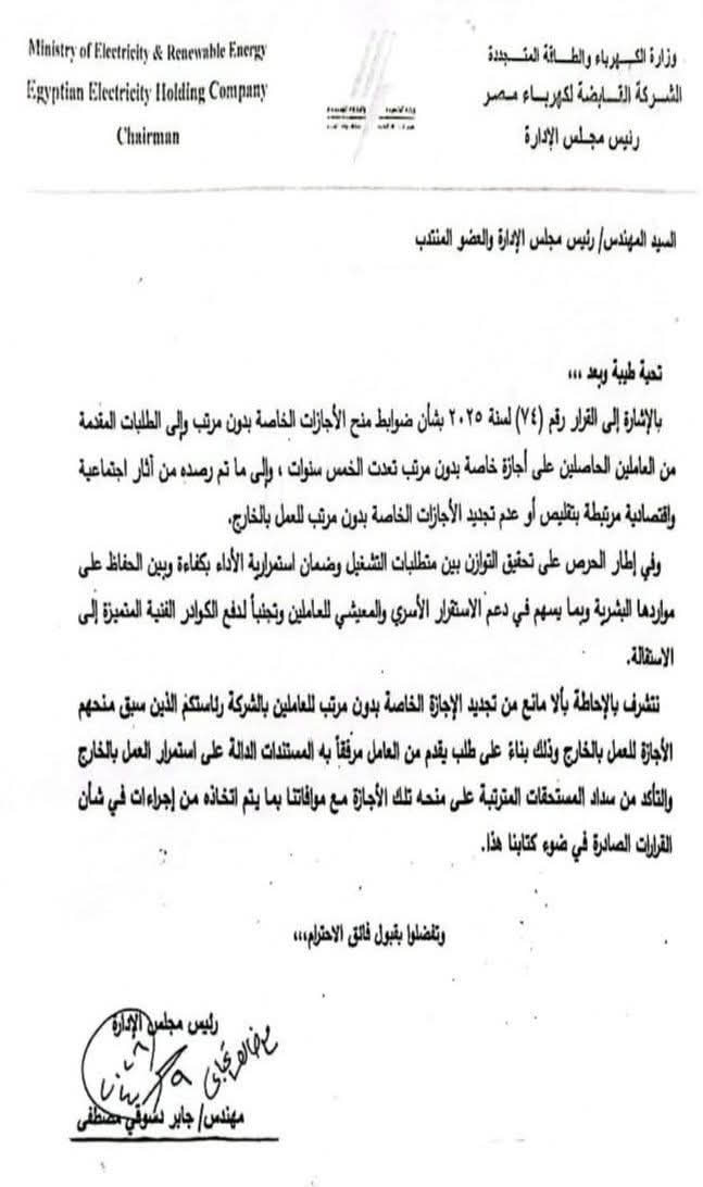 أصدرت الشركة القابضة لكهرباء مصر، التابعة لوزارة الكهرباء والطاقة المتجددة، قرارًا جديدًا بشأن تنظيم الإجازات الخاصة بدون مرتب للعاملين، خاصة المرتبطين بالعمل خارج البلاد، في خطوة تستهدف تحقيق التوازن بين متطلبات العمل والاستقرار الاجتماعي للعاملين، مع الالتزام بتقديم كافة المستندات التى تثبت عملهم خارج جمهورية مصر العربية.