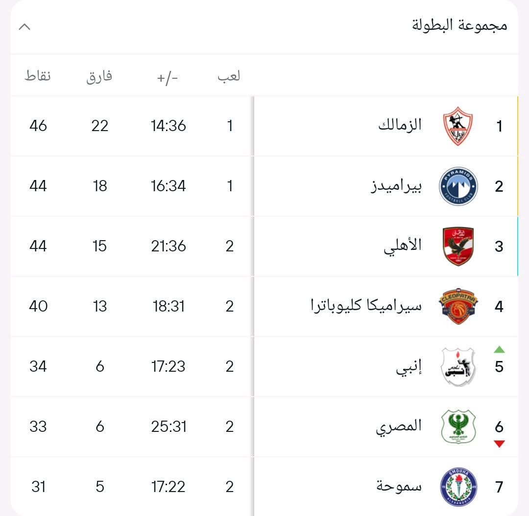 ويأتي سيراميكا كليوباترا في المركز الرابع برصيد 40 نقطة، بينما يحتل إنبي المركز الخامس برصيد 34 نقطة، متقدمًا على المصري صاحب المركز السادس برصيد 33 نقطة.
