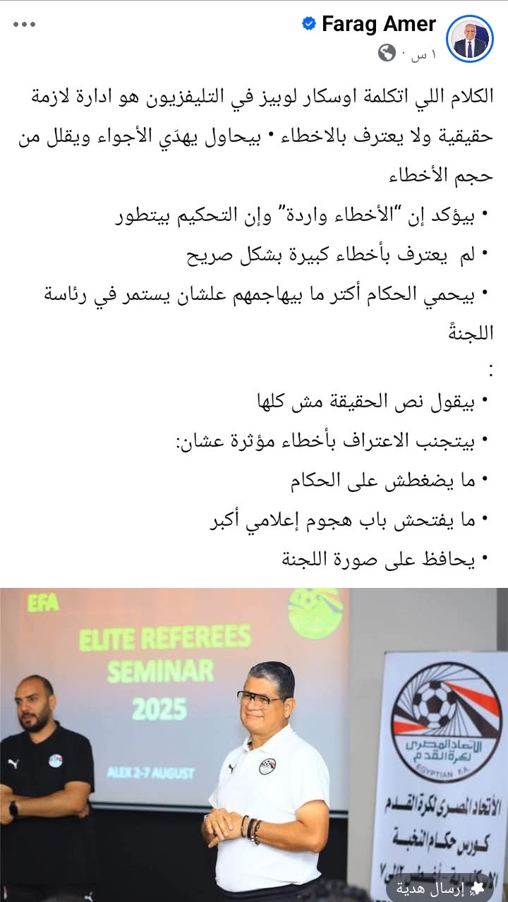 واضاف عامر عبر حسابه علي فيسبوك" أن اوسكار أكد أن الأخطاء التحكيمية “واردة” وأن المنظومة التحكيمية في حالة تطور، لكنه لم يعترف بوجود أخطاء بشكل صريح في المباريات.