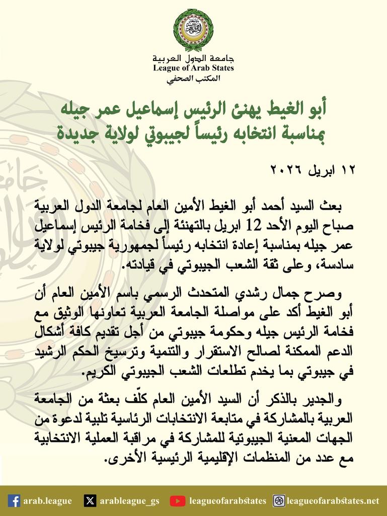 كما شدد على التزام الجامعة بتقديم جميع أشكال الدعم الممكنة لتعزيز ركائز الاستقرار والتنمية وترسيخ الحكم الرشيد في جيبوتي، بما يلبي طموحات وتطلعات شعبها.