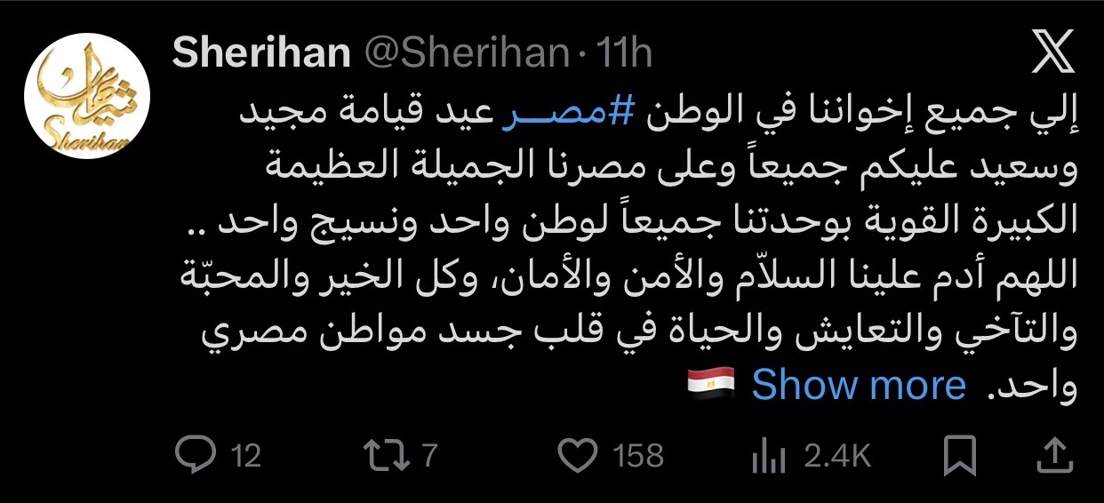 وأكدت شريهان في رسالتها على روح الوحدة الوطنية، مهنئة جميع المصريين بهذه المناسبة، ومشيرة إلى أهمية التماسك والترابط بين أبناء الوطن الواحد.