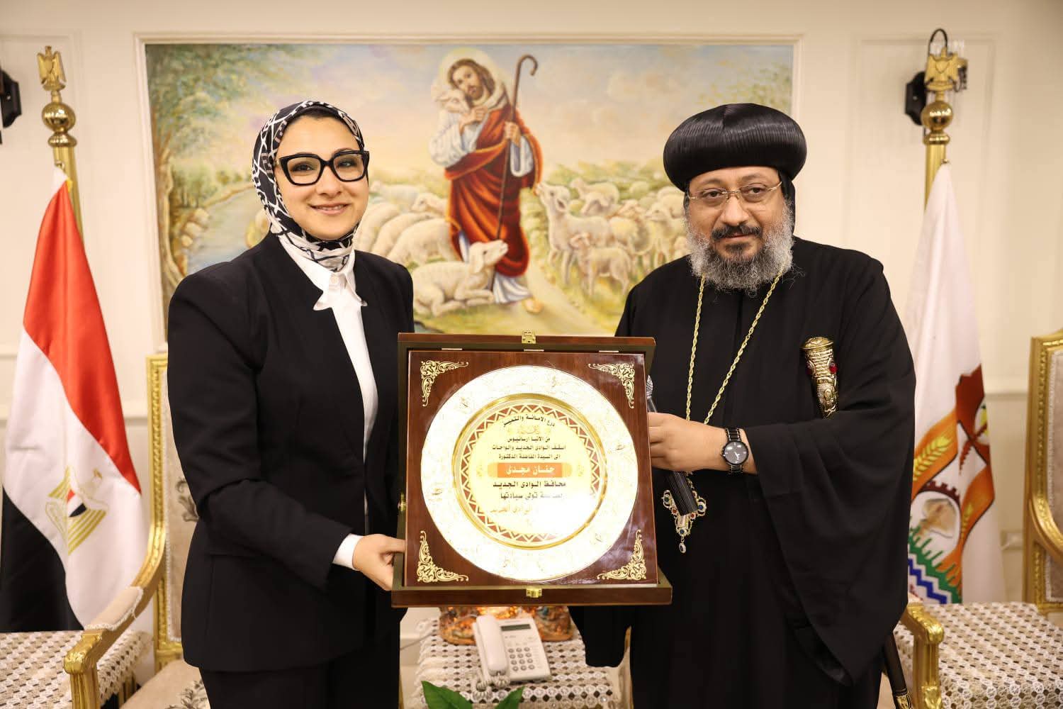 قامت حنان مجدي محافظ الوادي الجديد، اليوم، بزيارة لكنيسة السيدة العذراء بمدينة الخارجة؛ لتقديم التهنئة لنيافة الأنبا أرسانيوس أسقف الوادي الجديد والواحات وراعي الكنيسة، بمناسبة عيد القيامة المجيد.