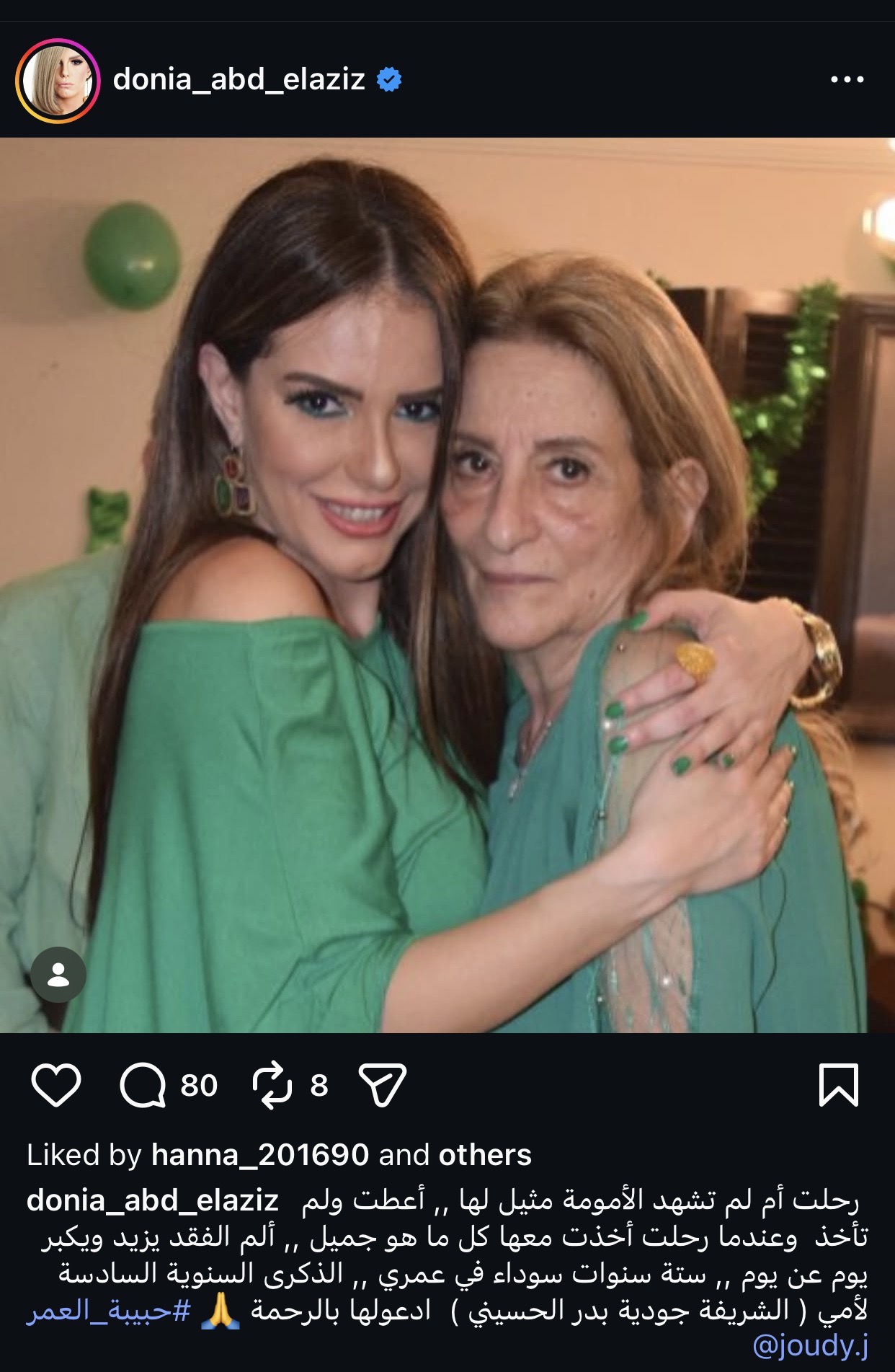 وكتبت دنيا عبدالعزيز، عبر "إنستجرام" تعليقا على صورة ظهرت فيها طفلة وتحملها والدتها: أول عيد أم وأنا أم بس من غير أمي، الله يرحمك يا أمي ويصبر قلبي على الوجع".