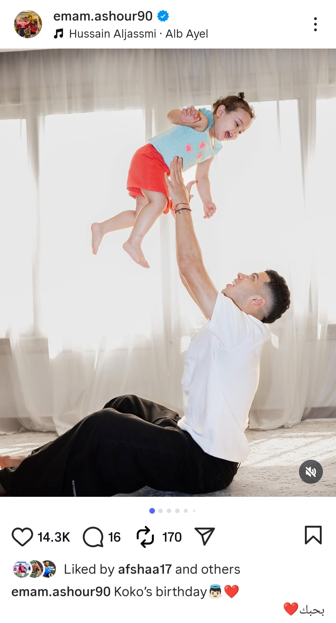 ونشر إمام عاشور عدة صور برفقة ابنته وزوجته، وعلق كاتبا: عيد ميلاد كوكو، بحبك.