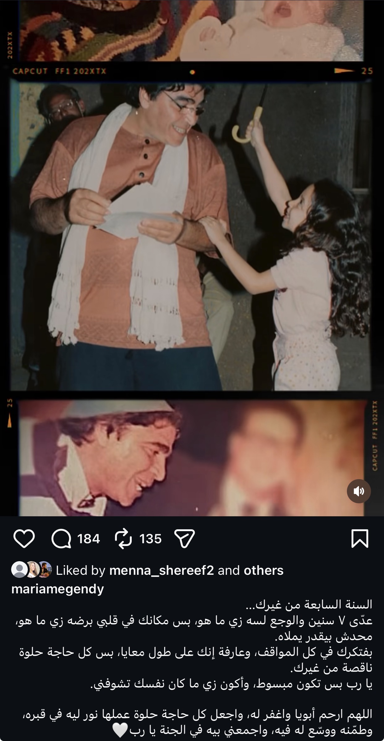 وكتبت مريم: “النهارده عيد ميلاد بابايا حبيبي، الله يرحمه ويغفر له ويجعل قبره روضة من رياض الجنة.. ياريت تدعوله وتفتكروه بالخير”