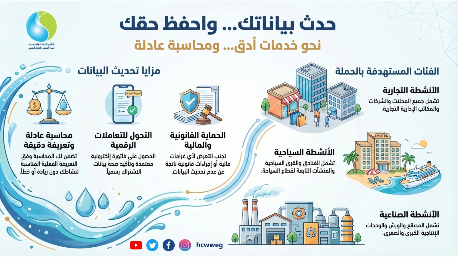 دعت الشركة القابضة لمياه الشرب والصرف الصحي عملاءها أصحاب الأنشطة غير المنزلية إلى سرعة تحديث بياناتهم المسجلة لدى الشركات التابعة، في إطار حرصها على تحسين مستوى الخدمات المقدمة وضمان دقة البيانات.