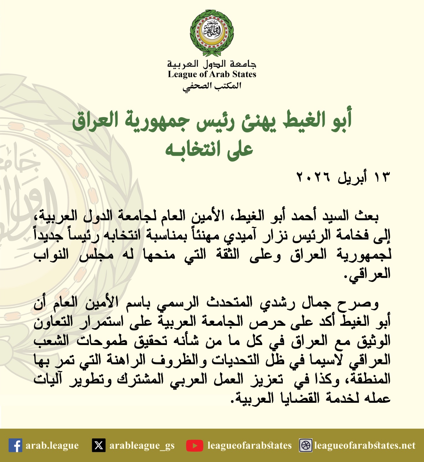 وصرح جمال رشدي المتحدث الرسمي باسم الأمين العام أن أبو الغيط أكد حرص الجامعة العربية على استمرار التعاون الوثيق مع العراق في كل ما من شأنه تحقيق طموحات الشعب العراقي لاسيما في ظل التحديات والظروف الراهنة التي تمر بها المنطقة، وكذا في تعزيز العمل العربي المشترك وتطوير آليات عمله لخدمة القضايا العربية.
