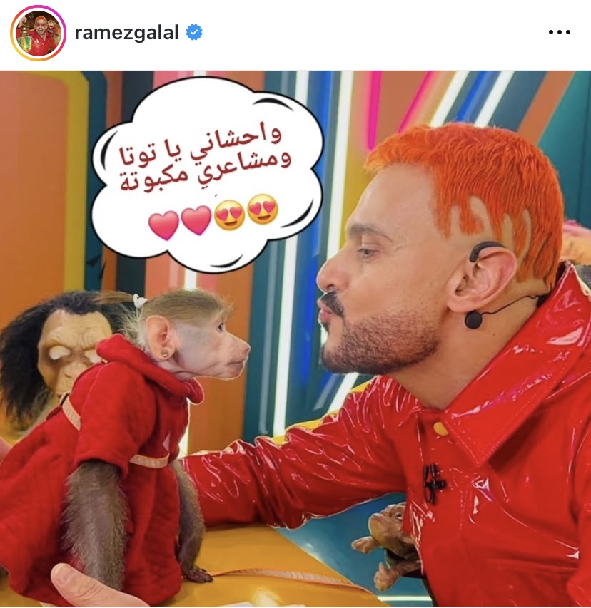 ونشر رامز جلال، صورة تجمعه مع القردة التي كانت تظهر معه في حلقات برنامج "رامز ليفل الوحش"، عبر حسابه على إنستجرام، وعلق: "واحشاني يا توتا ومشاعري مكبوتة".