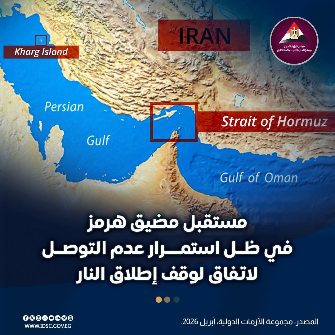 نشر مركز المعلومات ودعم اتخاذ القرار بمجلس الوزراء انفوجراف عبر صفحته الرسمية على موقع التواصل الاجتماعي فيس بوك بشأن مستقبل مضيق هرمز بعد فشل المفاوضات بين أمريكا وإيران.