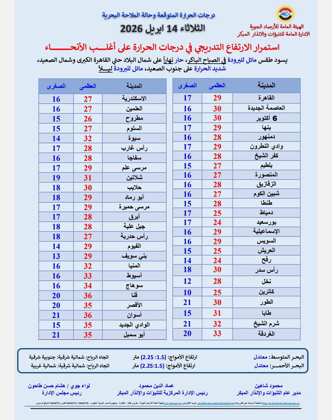 درجات الحرارة ليوم الثلاثاء ١٤ ابريل ٢٠٢٦