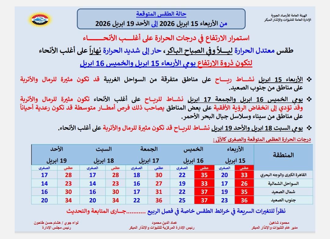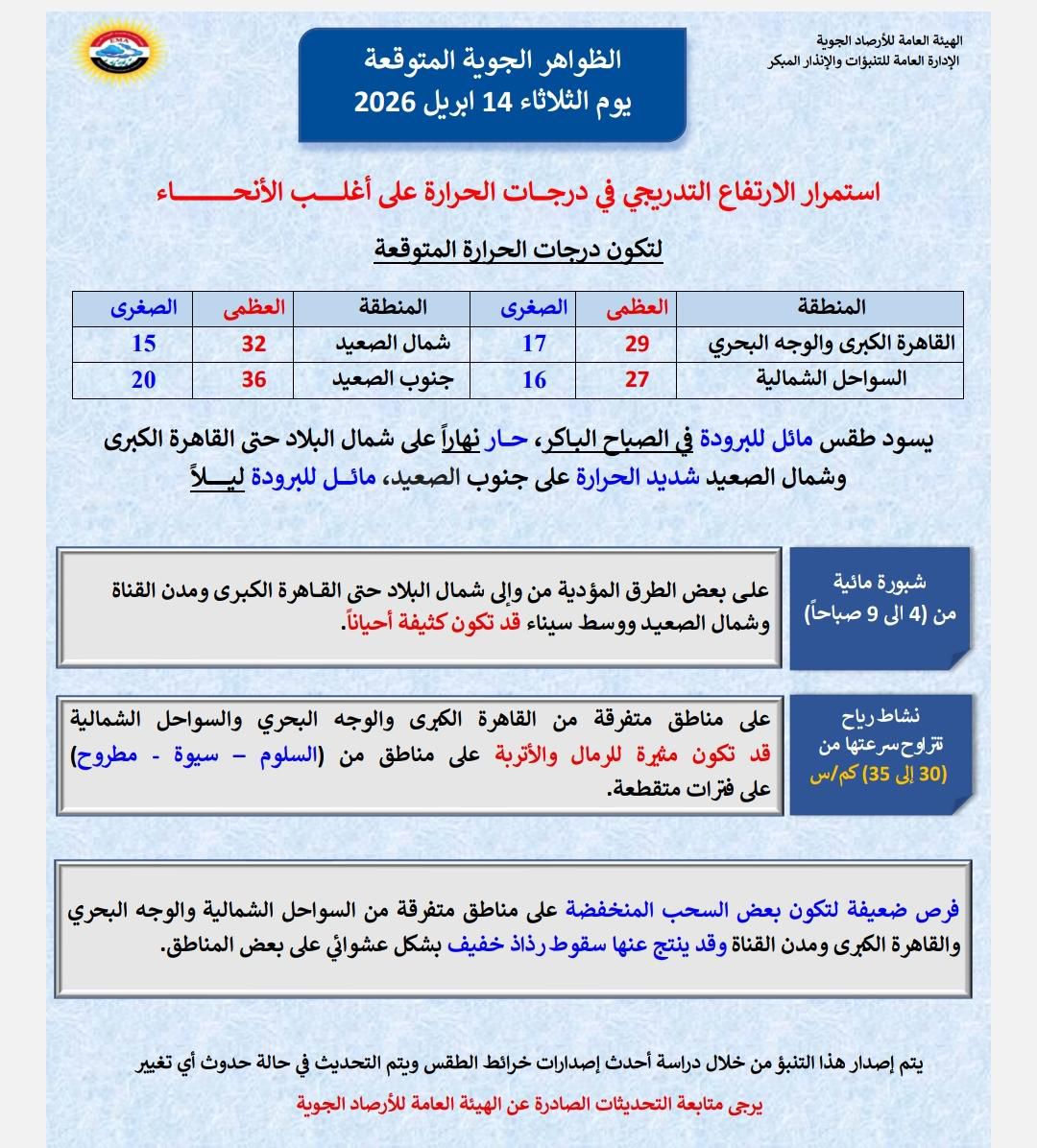يبحث المواطنون عن ذروة الموجة الحارة وموعد تراجع الحرارة، و تشهد حالة الطقس في مصر غدا الثلاثاء 14 أبريل 2026، تقلبات ملحوظة وفقا لبيان الهيئة العامة للأرصاد الجوية، حيث يسود طقس مائل للبرودة خلال ساعات الصباح الباكر، بينما يتحول إلى طقس حار نهارا على مناطق شمال البلاد حتى القاهرة الكبرى وشمال الصعيد، ويصل إلى شديد الحرارة على جنوب الصعيد، على أن يعود للاعتدال المائل للبرودة خلال فترات الليل.