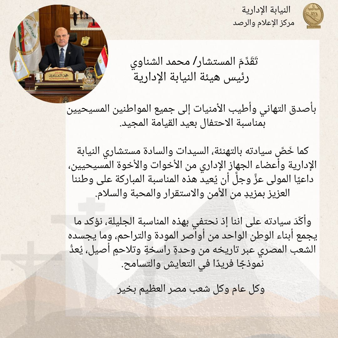 تَقَدَّمَ المستشار محمد الشناوي رئيس هيئة النيابة الإدارية، بأصدق التهاني وأطيب الأمنيات إلى جميع المواطنين المسيحيين بمناسبة الاحتفال بعيد القيامة المجيد.