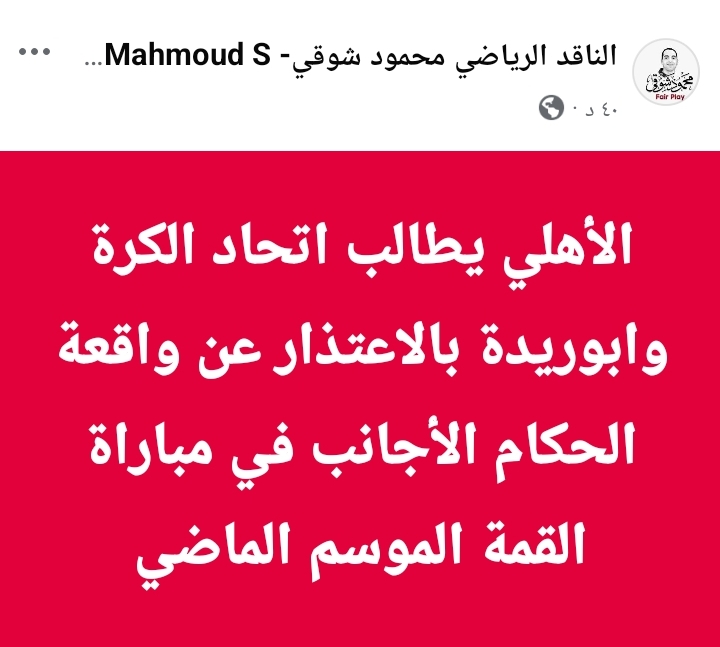 وكتب الناقد الرياضي محمود شوقي عبر حسابه علي فيسبوك "الأهلي يطالب اتحاد الكرة وابوريدة بالاعتذار عن واقعة الحكام الأجانب في مباراة القمة الموسم الماضي"