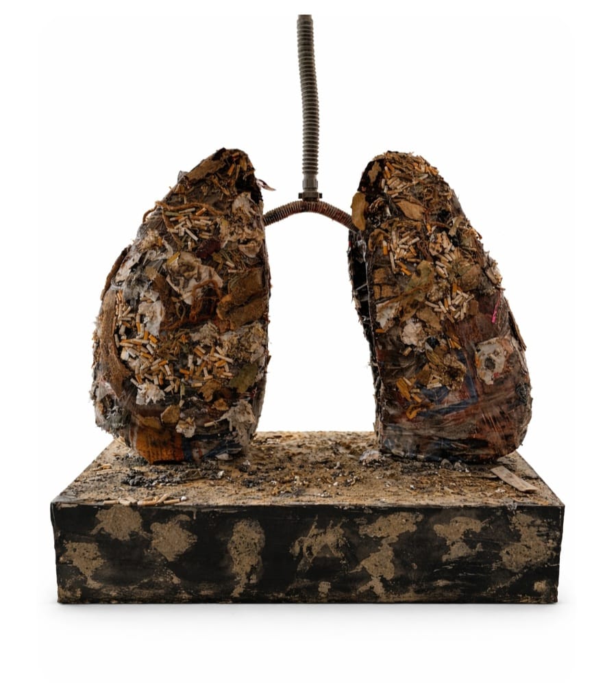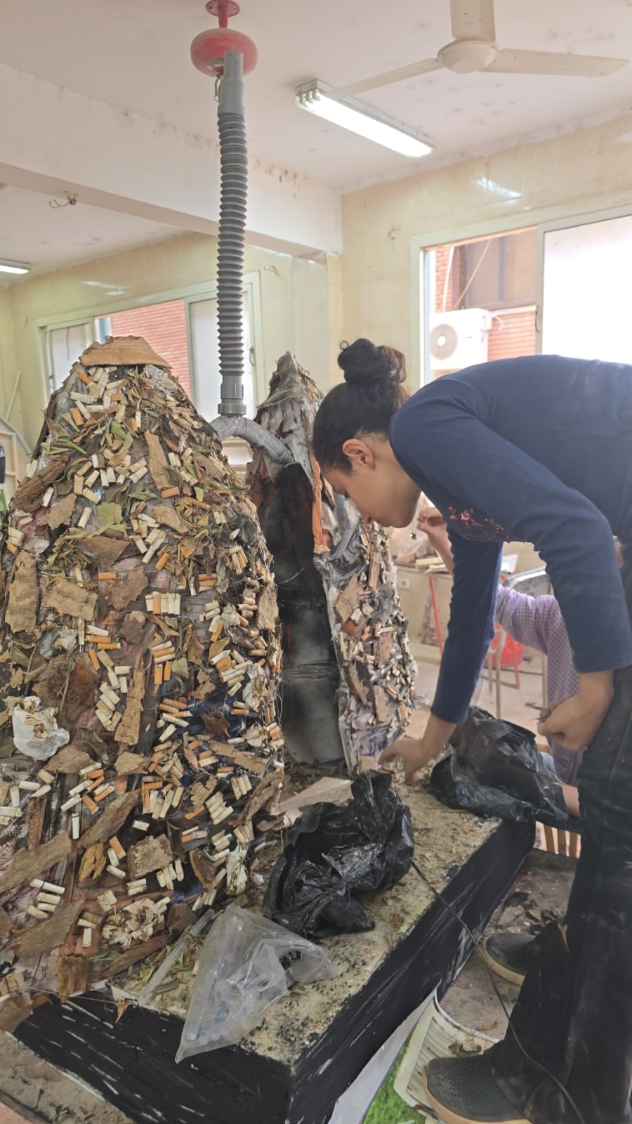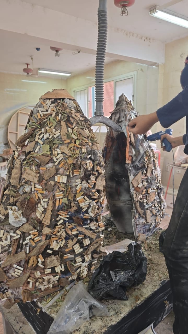 وأوضحت الدكتورة عصمت محمد صادق أن الأعمال الفنية اعتمدت على توظيف مخلفات بيئية تحمل دلالات رمزية، مثل أعقاب السجائر والتبغ، والأخشاب الجافة، إلى جانب استخدام خراطيم الصرف لمحاكاة القصبة الهوائية، بما يعكس التأثيرات السلبية للتدخين على الجهاز التنفسي.