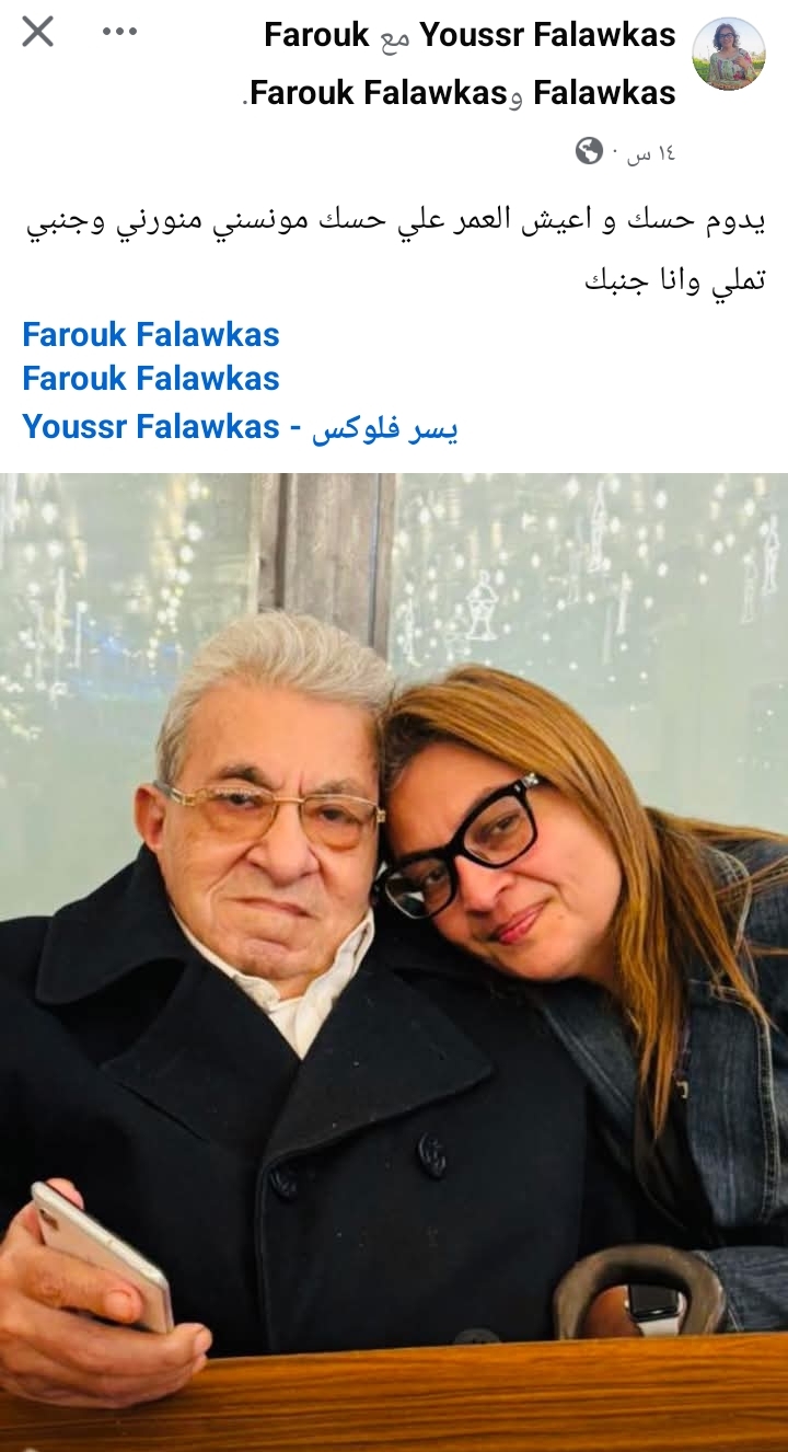 ونشرت يسر فلوكس صورة تجمعها بوالدها في أحدث ظهور له، وعلّقت عليها قائلة: «يدوم حسك وأعيش العمر على حسك، مونسني ومنورني وجنبي دايمًا وأنا جنبك».