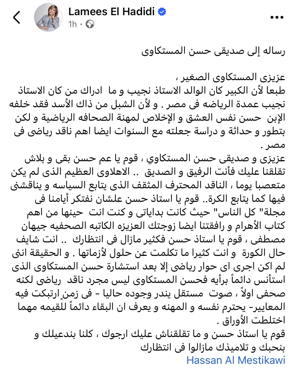 وجهت الإعلامية لميس الحديدي رسالة إنسانية مؤثرة إلى الناقد الرياضي حسن المستكاوي، عبر حسابها الرسمي على موقع “فيسبوك”، عبّرت خلالها عن قلقها الشديد عليه، متمنية له الشفاء العاجل