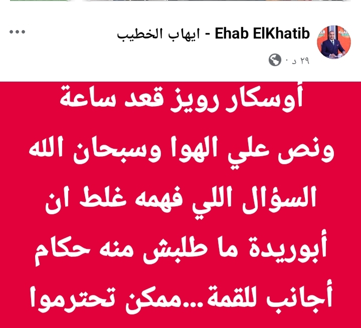 وكتب الخطيب عبر حسابه على موقع «فيسبوك»: «أوسكار رويز قعد ساعة ونص على الهوا، وسبحان الله السؤال اللي فهمه غلط إن هاني أبو ريدة ما طلبش منه حكام أجانب للقمة… ممكن تحترموا عقول الناس شوية».