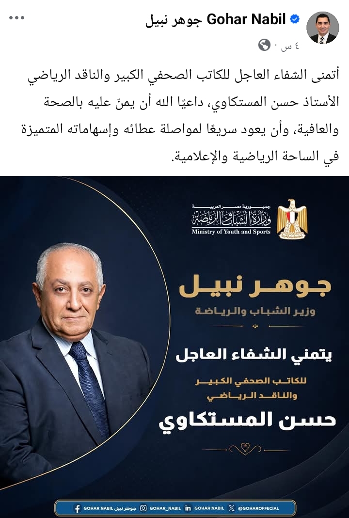 وكتب وزير الشباب والرياضة عبر حسابه على موقع التواصل الاجتماعي "فيسبوك": "أتمنى الشفاء العاجل للكاتب الصحفي الكبير والناقد الرياضي الأستاذ حسن المستكاوي، داعيًا الله أن يمنّ عليه بالصحة والعافية، وأن يعود سريعًا لمواصلة عطائه وإسهاماته المتميزة في الساحة الرياضية والإعلامية".