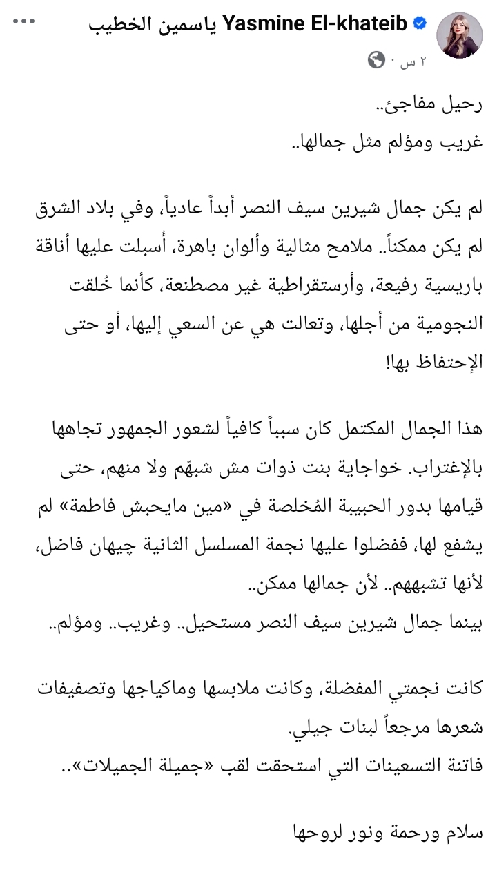 وحرصت ياسمين الخطيب على أحياء ذكري الراحلة برسالة مؤثرة نشرتها عبر حسابها على موقع "فيسبوك" وصفت فيها رحيلها بالمفاجئ والمؤلم، مشيرة إلى أن جمال شيرين سيف النصر كان استثنائيًا وغير تقليدي، ما جعلها مختلفة عن غيرها من نجمات جيلها.