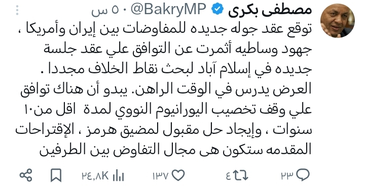 وكتب بكري فى تغريدة له على صفحته الرسمية بمنصة "إكس":" اتوقع عقد جوله جديده للمفاوضات بين إيران وأمريكا ، جهود وساطيه أثمرت عن التوافق علي عقد جلسة جديده في إسلام آباد لبحث نقاط الخلاف مجددا . العرض يدرس في الوقت الراهن. يبدو أن هناك توافق علي وقف تخصيب اليورانيوم النووي لمدة اقل من١٠ سنوات ، وإيجاد حل مقبول لمضيق هرمز ، الإقتراحات المقدمه ستكون هي مجال التفاوض بين الطرفين"