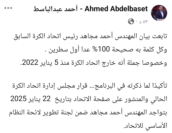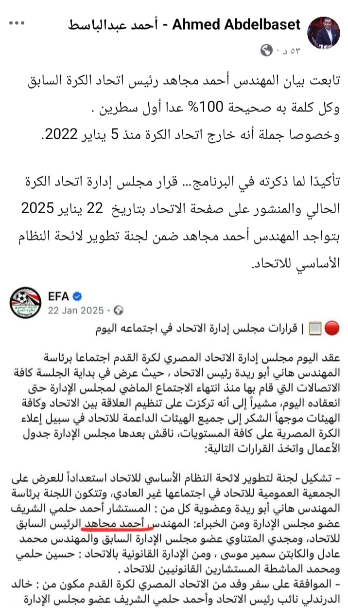 ونشر عبد الباسط عبر حسابه على موقع "فيسبوك" بيانًا سابقًا للاتحاد المصري لكرة القدم، يؤكد وجود أحمد مجاهد ضمن لجنة تطوير لائحة النظام الأساسي للاتحاد، وكتب قائلاً: «تأكيدًا لما ذكرته في البرنامج… قرار مجلس إدارة اتحاد الكرة الحالي والمنشور على صفحة الاتحاد بتاريخ 22 يناير 2025 بتواجد المهندس أحمد مجاهد ضمن لجنة تطوير لائحة النظام الأساسي للاتحاد"