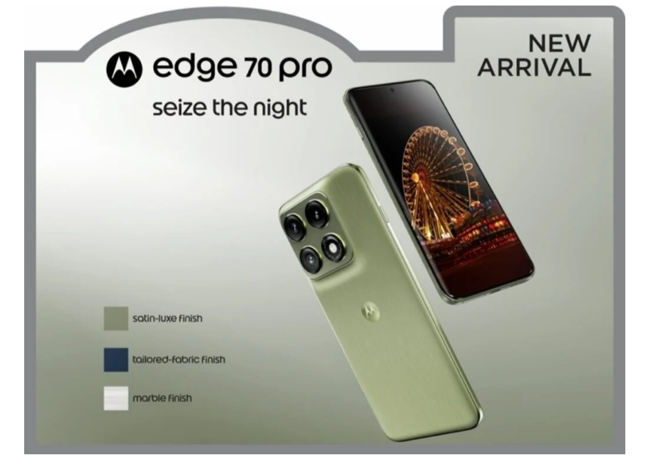كشف تسريب جديد من موقع Ytechb عن صور عالية الدقة لهاتف Edge 70 Pro بألوان وتشطيبات متعددة كما تُظهر الصور التشويقية التي نشرتها موتورولا نسخًا باللون الأزرق والأخضر والرمادي الفاتح بتشطيب رخامي، مما يشير إلى أن توفرها قد يختلف باختلاف المناطق. يتميز الإصدار الأزرق بنسيج قماشي مانع للانزلاق، بينما يتميز الإصدار البني بلوحة خلفية مستوحاة من الخشب.